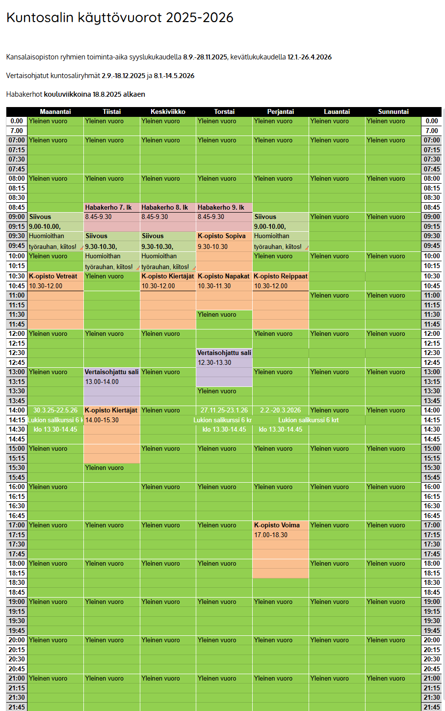 Kansalaisopiston kuntosaliryhmien kausi alkaa 8.9.2025 ja päättyy syyskauden osalta pääsääntöisesti 28.11.2025 mennessä. Kevätkauden kurssit alkavat 12.1.2026 ja päättyvät 26.4.2026 mennessä. Vertaisohjatut kuntosaliryhmät toimivat 2.9.-18.12.2025 ja 8.1.-14.5.2026. Pidätämme oikeuden muutoksiin.