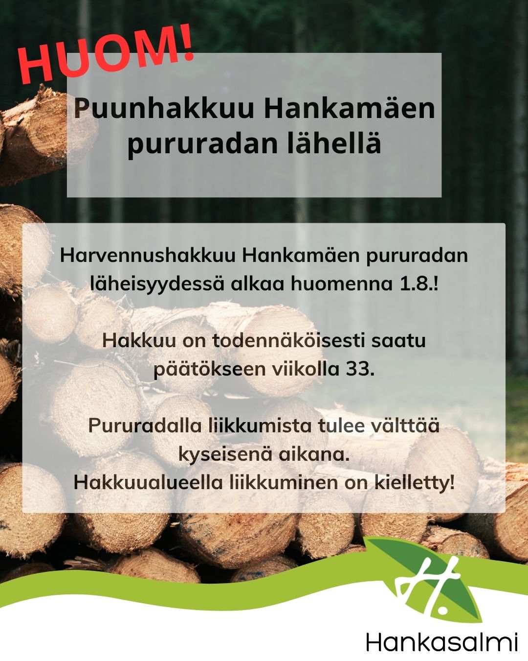 Harvennushakkuu Hankamäen pururadan läheisyydessä alkaa huomenna 1.8.!