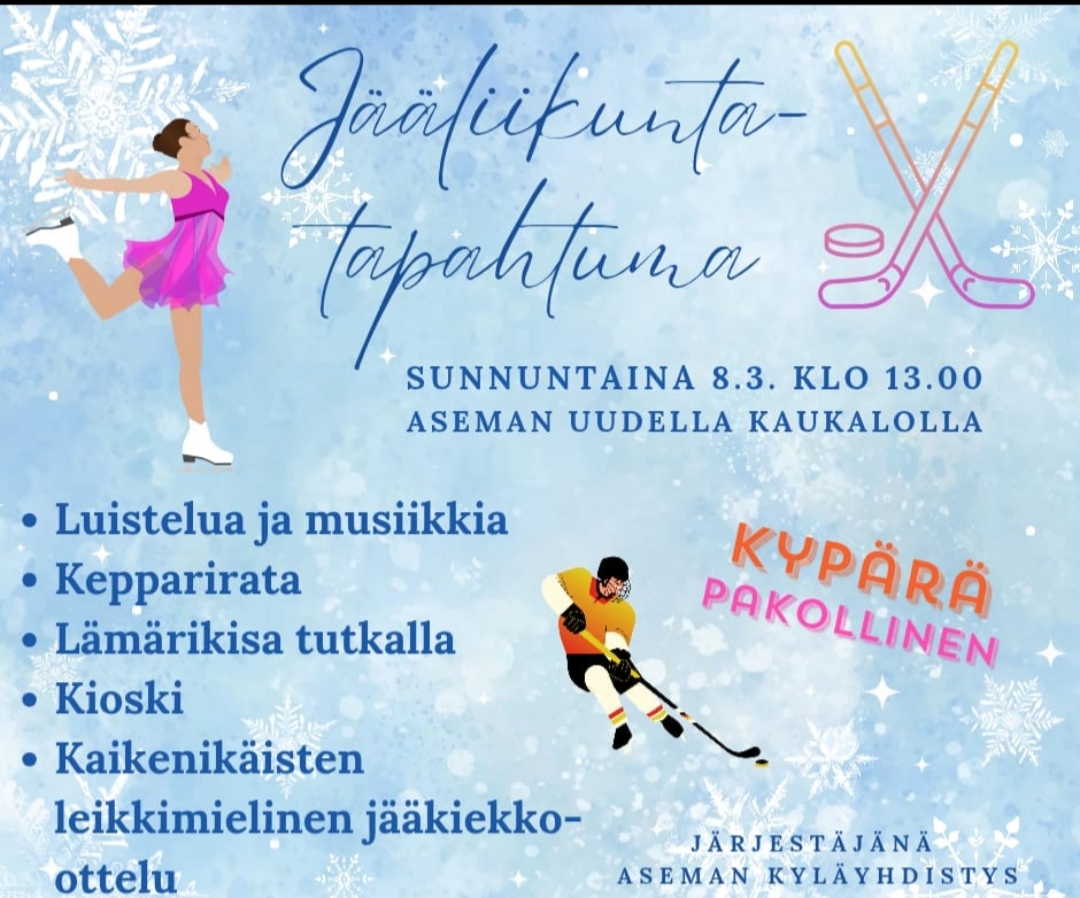 Kaiken ikäiset - ja tasoiset luistelijat ovat tervetulleita! Tarkkaa loppuaikaa ei ole, nautitaan jäällä niin kauan kuin jaksetaan. Kypäräpakko kaukalossa. Keppihepatkin pääsee jäälle, oma heppa mukaan. Kioskista pikkurahalla välipalaa.