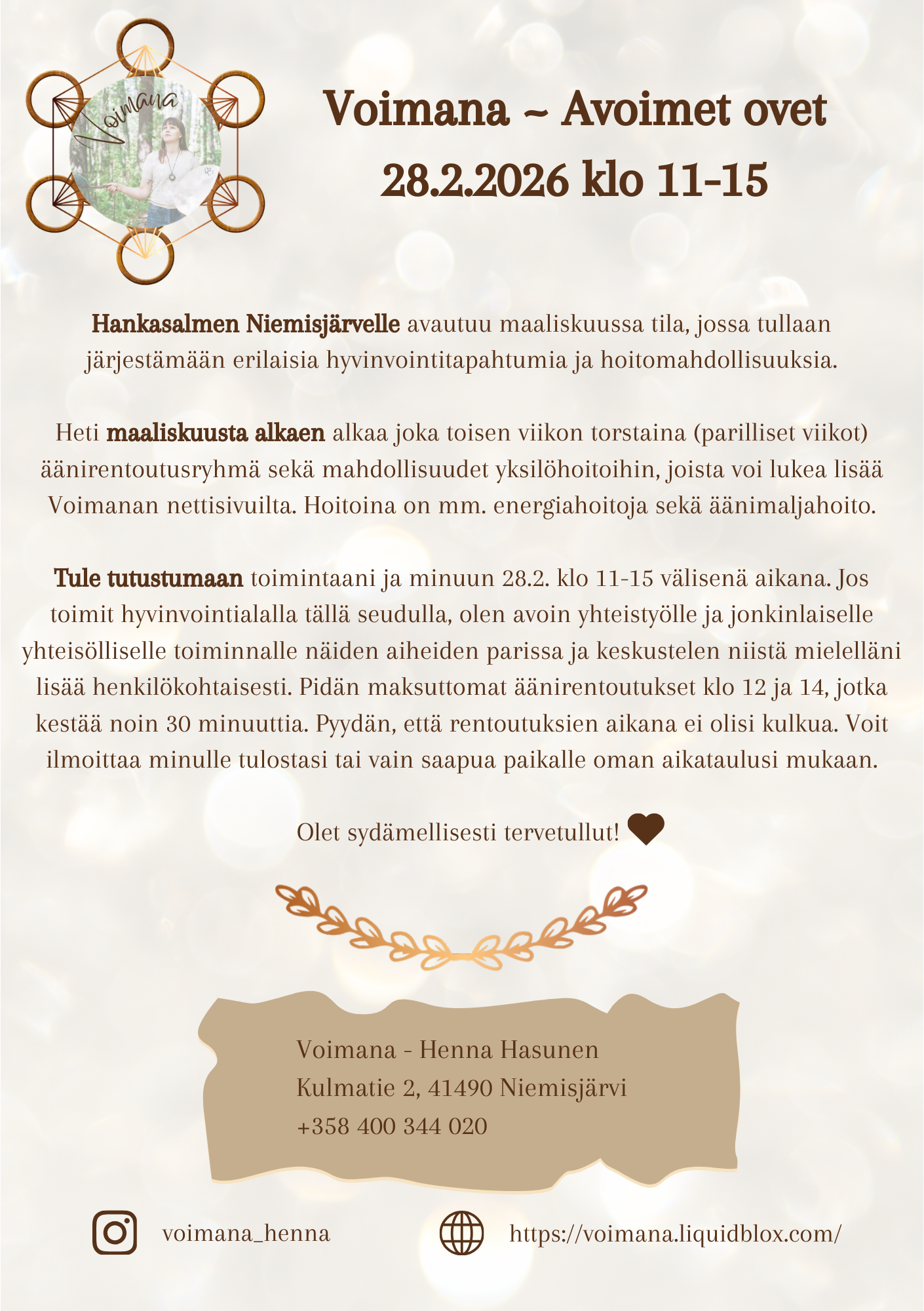 Tervetuloa tutustumaan Voimanan toimintaan, joka alkaa maaliskuussa. Tapahtumassa maksuttomat äänirentoutukset klo 12 ja 14