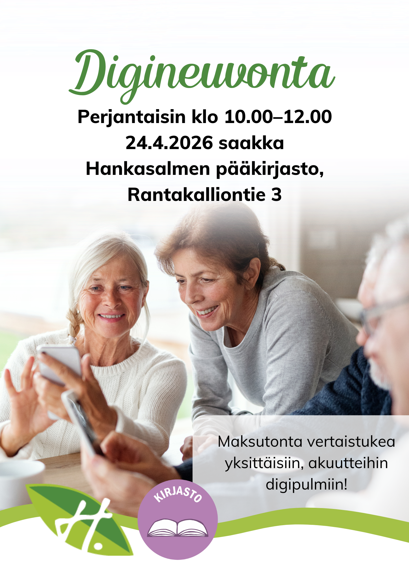 Maksutonta vertaistukea yksittäisiin, akuutteihin digipulmiin. Ota oma laite mukaan ja tule paikalle: katsotaan yhdessä, saisimmeko ongelmasi ratkaistua!