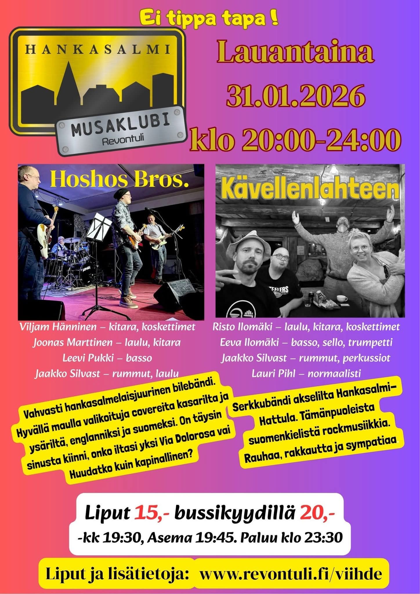 Tammikuussa musaklubilla Hoshos Bros. (Viljam Hänninen, Joonas Marttinen, Leevi Pukki, Jaakko Silvast) ja Kävellenlahteen (Risto Ilomäki, Eeva Ilomäki, Jaakko Silvast, Lauri Pihl). Liput 15 €, bussikyydillä 20 € (kk 19.30, Asema 19.45. Paluu klo 23.30)