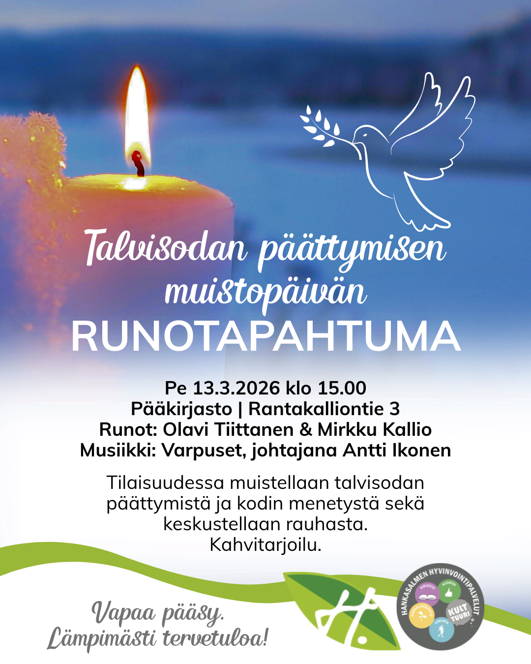 Talvisodan päättymisen muistopäivän runotapahtuma Pe 13.3.2026 klo 15-16 Pääkirjasto, näyttelytila Runot: Olavi Tiittanen & Mirkku Kallio Musiikki: Varpuset, johtajana Antti Ikonen Vapaa pääsy Järjestää hyvinvointipalvelut Tilaisuudessa muistellaan talvisodan päättymistä ja kodin menetystä sekä keskustellaan rauhasta. Kahvitarjoilu.