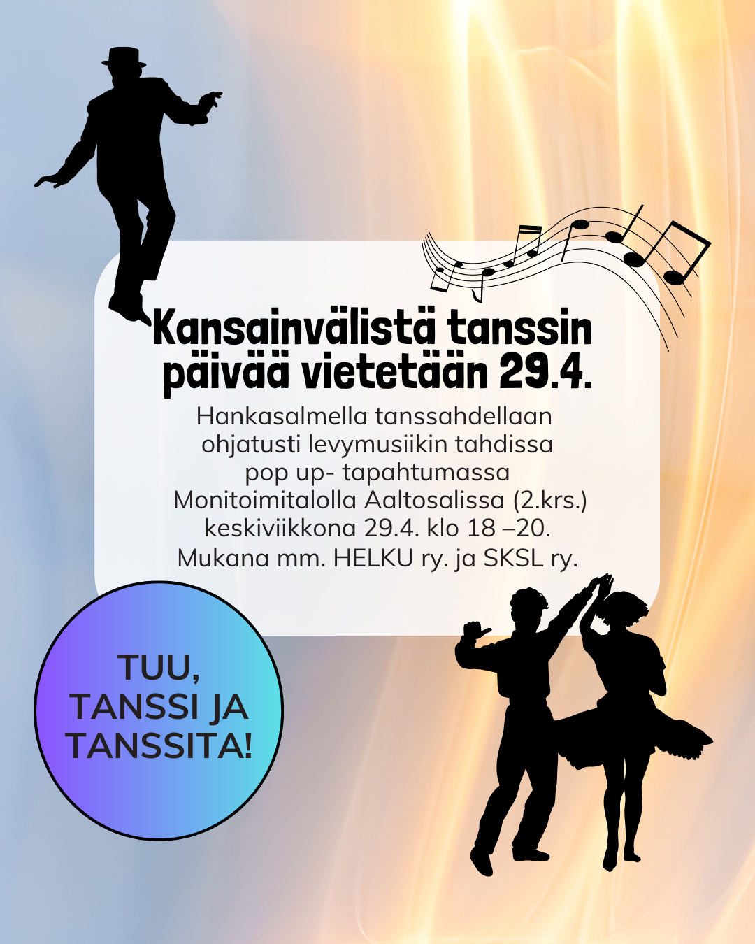 Kansainvälistä tanssin päivää vietetään 29.4. Hankasalmella tanssahdellaan ohjatusti levymusiikin tahdissa pop-up-tapahtumassa Monitoimitalon Aalto-salissa (2. krs) klo 18–20. Mukana mm. Helku ry ja SKLS ry. Tuu, tanssi ja tanssita!