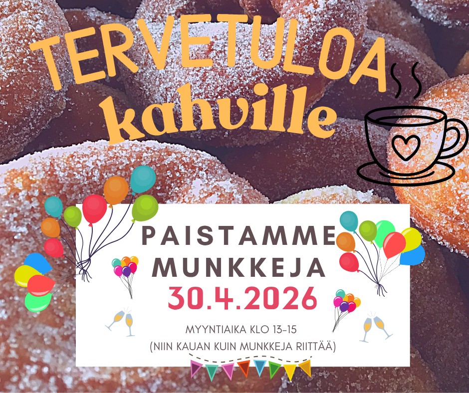 Paistamme munkkeja 30.4.2026, myyntiaika klo 13–15, niin kauan kuin munkkeja riittää. Tervetuloa kahville! Tervetuloa istumaan iltaa muiden vanhempien kanssa! Lapsille pientä puuhaa. Paikalla vuoroviikoin eri toimijoita, kuten perhekeskus, seurakunta ja MLL. Vanhempien olohuone avoinna pääsääntöisesti jumppakoulukauden ajan.