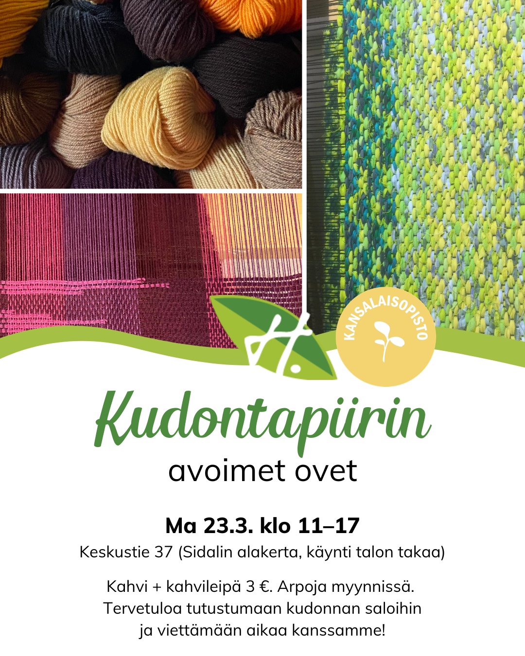 Ma 23.3. klo 11–17 Keskustie 37 (Sidalin alakerta, käynti talon takaa) Kahvi + kahvileipä 3 €. Arpoja myynnissä. Tervetuloa tutustumaan kudonnan saloihin ja viettämään aikaa kanssamme!