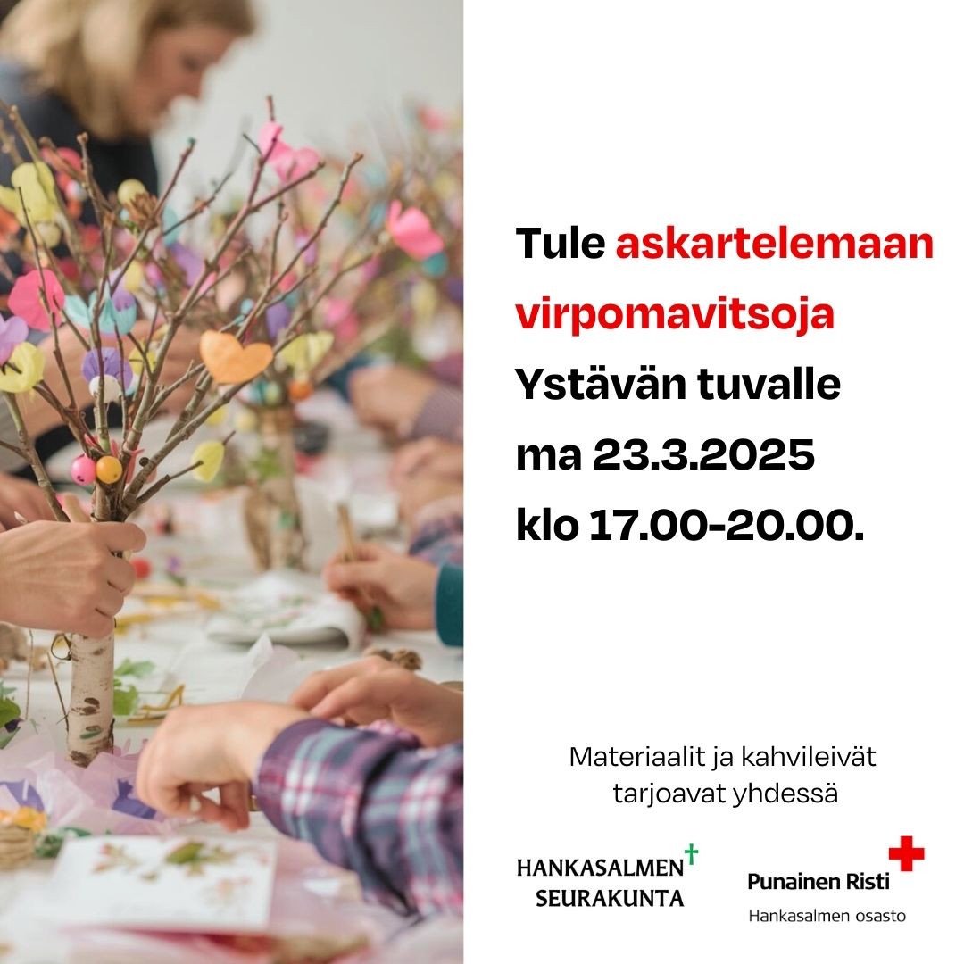 Hankasalmen SPR ja seurakunta järjestävät yhdessä virpomavitsojen askarteluillan SPR:n Ystävän tuvalla Hankasalmen Asemalla.