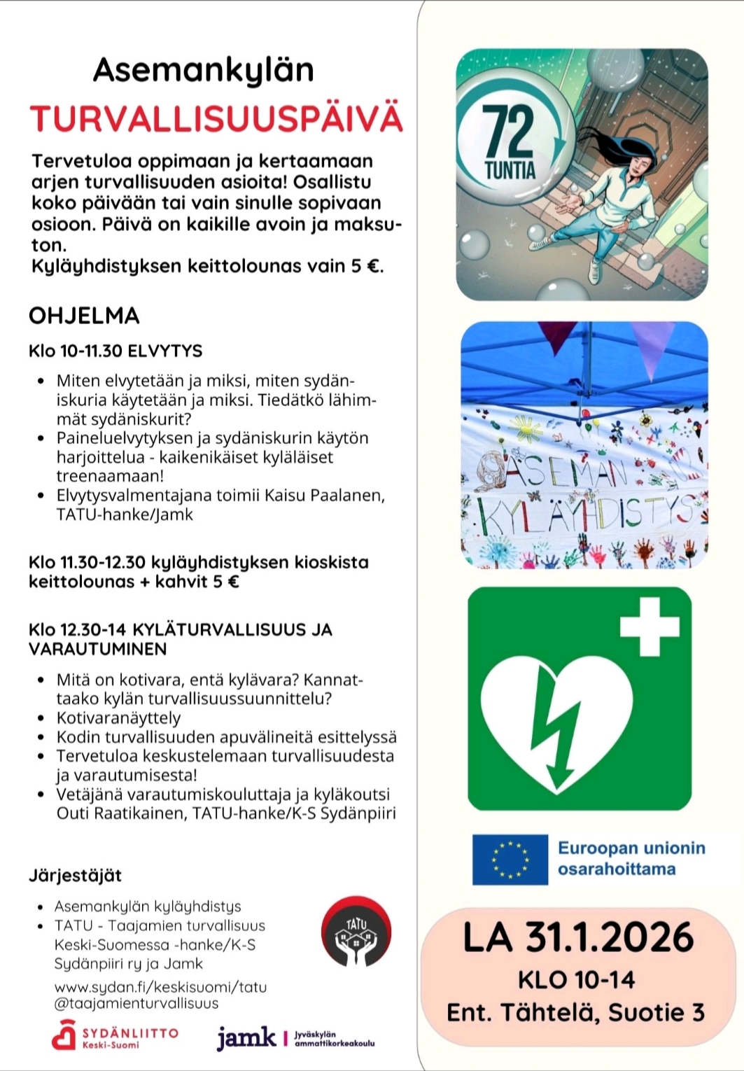Tule harjoittelemaan entiseen Tähtelään, Suotie 3 elvytystä, sydäniskurin käyttöä, pohtimaan kylän ja kodin turvallisuutta. Maksuton tapahtuma. Kyläyhdistyksen keittolounas+kahvit 5€. Kaikille avoin tapahtuma. Järjestää Asemanseudun kyläyhdistys ja TATU-taajamien turvallisuus Keski-Suomessa hanke/K-S Sydänpiiri ja Jamk Vetäjänä varautumiskouluttaja ja kyläkoutsi Outi Raatikainen