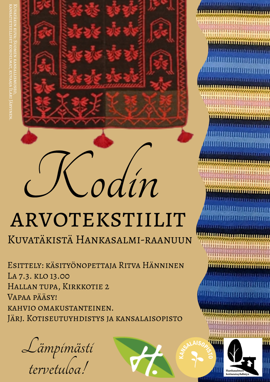 Uintireissu Suonenjoen uimahalliin. Hinta 20 € sis. uinnin, vesijumpan, sämpyläkahvit sekä matkat. Linja-auton aikataulu: Niemisjärvi klo 8.30, Asema klo 8.45, kk klo 9. Perilläoloaika klo 10–12. Yhteyshenkilö Christina Häkkinen (p. 0400 909 852). Uintireissut toteutuvat, kun mukaan lähtee vähintään 35 henkeä. Muutokset mahdollisia, seuraa ilmoitukset Hankasalmen Sanomissa. Yhteistyössä kansalaisopisto ja Eläkeliitto Hankasalmen yhdistys. Kaikille avoin […] Tervetuloa muskariin niin vauvan kuin isommankin lapsen kanssa! Muskarituokio klo 9.30-10.15, muu aika vapaata yhdessäoloa. Muskaria vetää musiikkikasvattaja Jesi Blomgren. Joka toinen tiistai perhekeskuksen kerhotilassa monitoimitalon yläkerrassa. Muskarissa yhteistyötahona Hankasalmen kunnan kansalaisopisto.