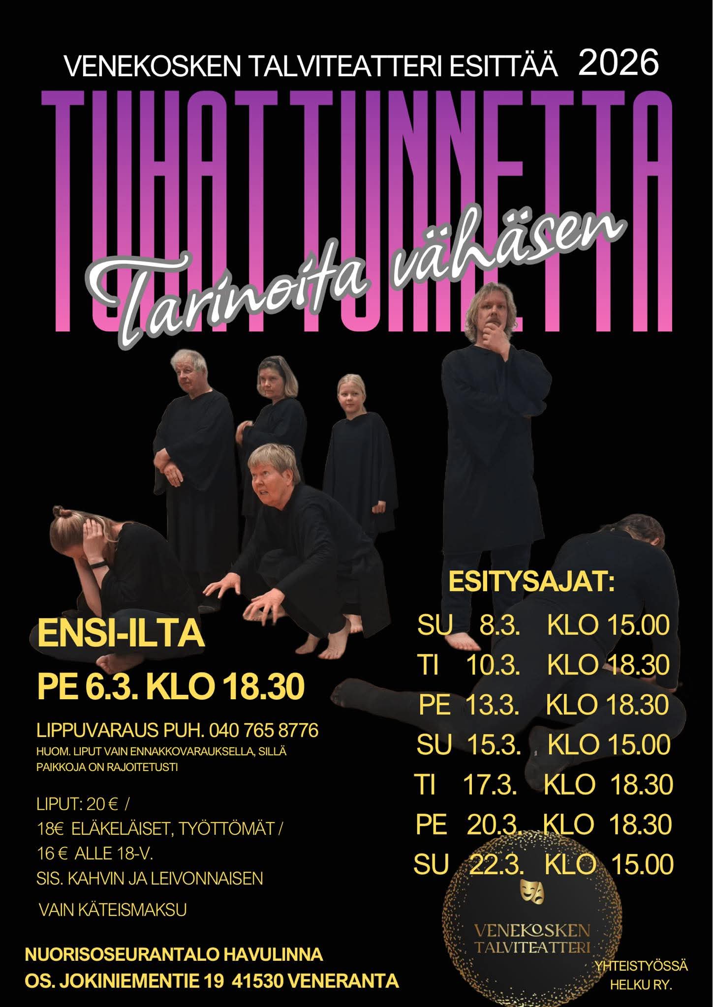 Venekosken talviteatteri esittää näytelmän Tuhat tunnetta – tarinoita vähäsen. Ensi-ilta pe 6.3. klo 18.30 Lippuvaraus puh. 040 765 8776 HUOM! Liput vain ennakkovarauksella, sillä paikkoja on rajoitetusti. Liput 20 €/ 18 € (eläkeläiset, työttömät)/ 16 € (alle 18-v.) Lippu sisältää kahvin ja leivonnaisen. Vain käteismaksu. Nuorisoseurantalo Havulinna, Jokiniementie 19, 41530 VENERANTA Venekosken talviteatteri, yhteistyössä Helku […] |