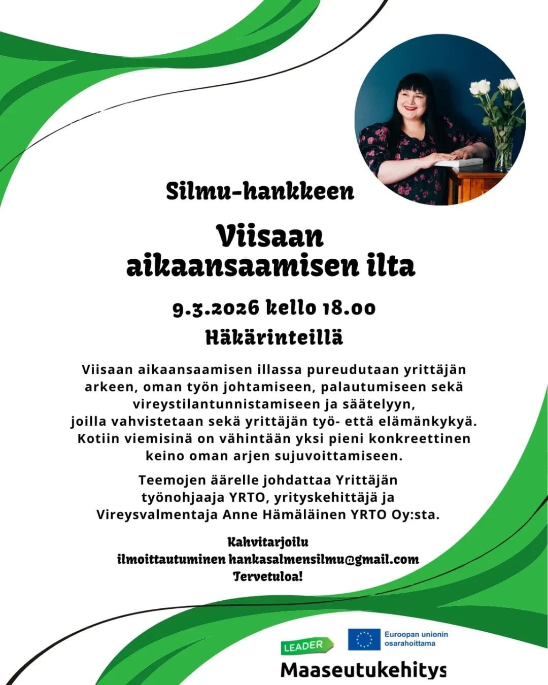 Viisaan aikaansaamisen illassa pureudutaan yrittäjän arkeen, oman työn johtamiseen, palautumiseen sekä vireystilan tunnistamiseen ja säätelyyn, joilla vahvistetaan sekä yrittäjän työ- että elämänkykyä. Teemojen äärelle johdattaa yrittäjän työnohjaaja, YRTO OY:n Anne Hämäläinen. Kahvitarjoilu. Ilmoittautuminen: hankasalmensilmu@gmail.com Tervetuloa! |