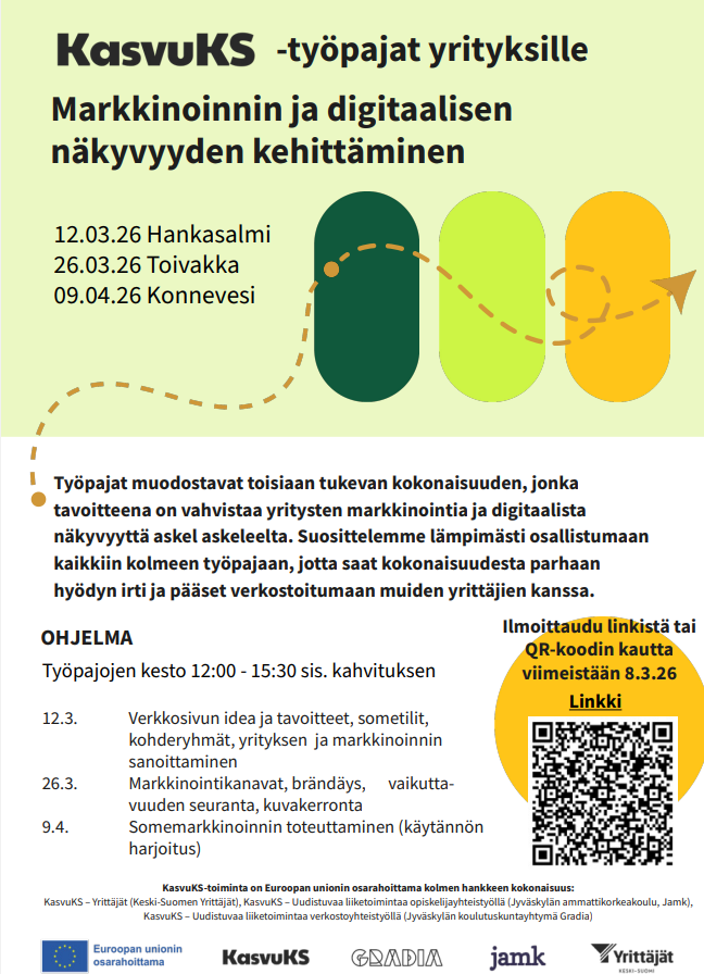 12.03.26 Hankasalmi 26.03.26 Toivakka 09.04.26 Konnevesi OHJELMA Työpajojen kesto 12:00 - 15:30 sis. kahvituksen 12.3. Verkkosivun idea ja tavoitteet, sometilit, kohderyhmät, yrityksen ja markkinoinnin sanoittaminen 26.3. Markkinointikanavat, brändäys, vaikuttavuuden seuranta, kuvakerronta 9.4. Somemarkkinoinnin toteuttaminen (käytännön harjoitus) Työpajat muodostavat toisiaan tukevan kokonaisuuden, jonka tavoitteena on vahvistaa yritysten markkinointia ja digitaalista näkyvyyttä askel askeleelta. Suosittelemme lämpimästi osallistumaan […]