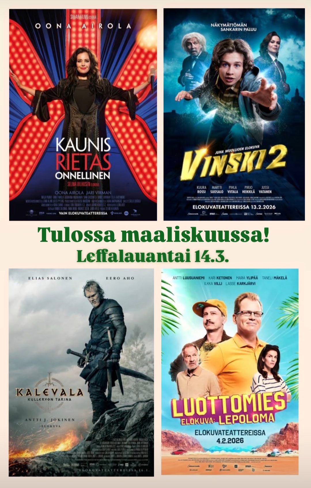 Kaunis rietas onnellinen 121 t 57 min, liput 15.00 € - Hankasalmi la 14.3. klo 12:00 Vinski 2 71 t 22 min, liput 13.00 € - Hankasalmi la 14.3. klo 14:15 Kalevala: Kullervon tarina 162 t 23 min, liput 15.00 € - Hankasalmi la 14.3. klo 16:00 Luottomies-elokuva: Lepoloma 71 t 28 min, liput 15.00 […] Hanksun hilpeät hoilaajat on matalan kynnyksen karaokelauluryhmä. Tervetuloa mukaan toimintaan!