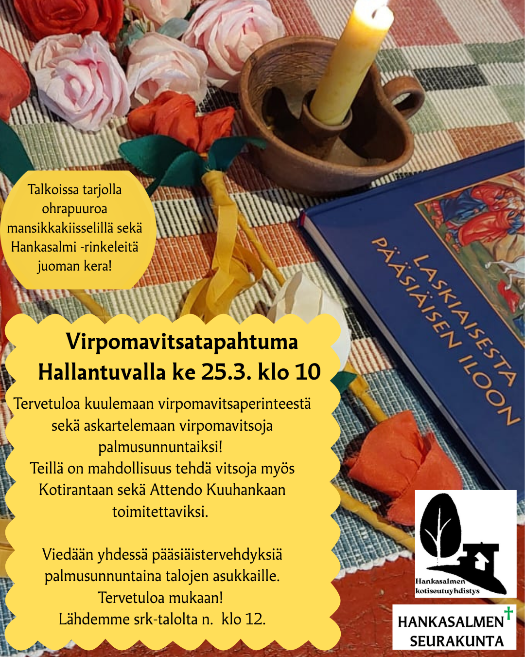 Tervetuloa kuulemaan virpomavitsaperinteestä sekä askartelemaan virpomavitsoja palmusunnuntaiksi. Teillä on mahdollisuus tehdä virpomavitsoja myös Kotirantaan ja Attendo Kuuhankaan toimitettavaksi. Viedään yhdessä pääsiäistervehdyksiä palmusunnuntaina talojen asukkaille. Tervetuloa mukaan! Lähdemme seurakuntatalolta noin klo 12.00. Talkoissa tarjolla ohrapuuroa mansikkakiisselillä sekä Hankasalmi-rinkeleitä juoman kera!